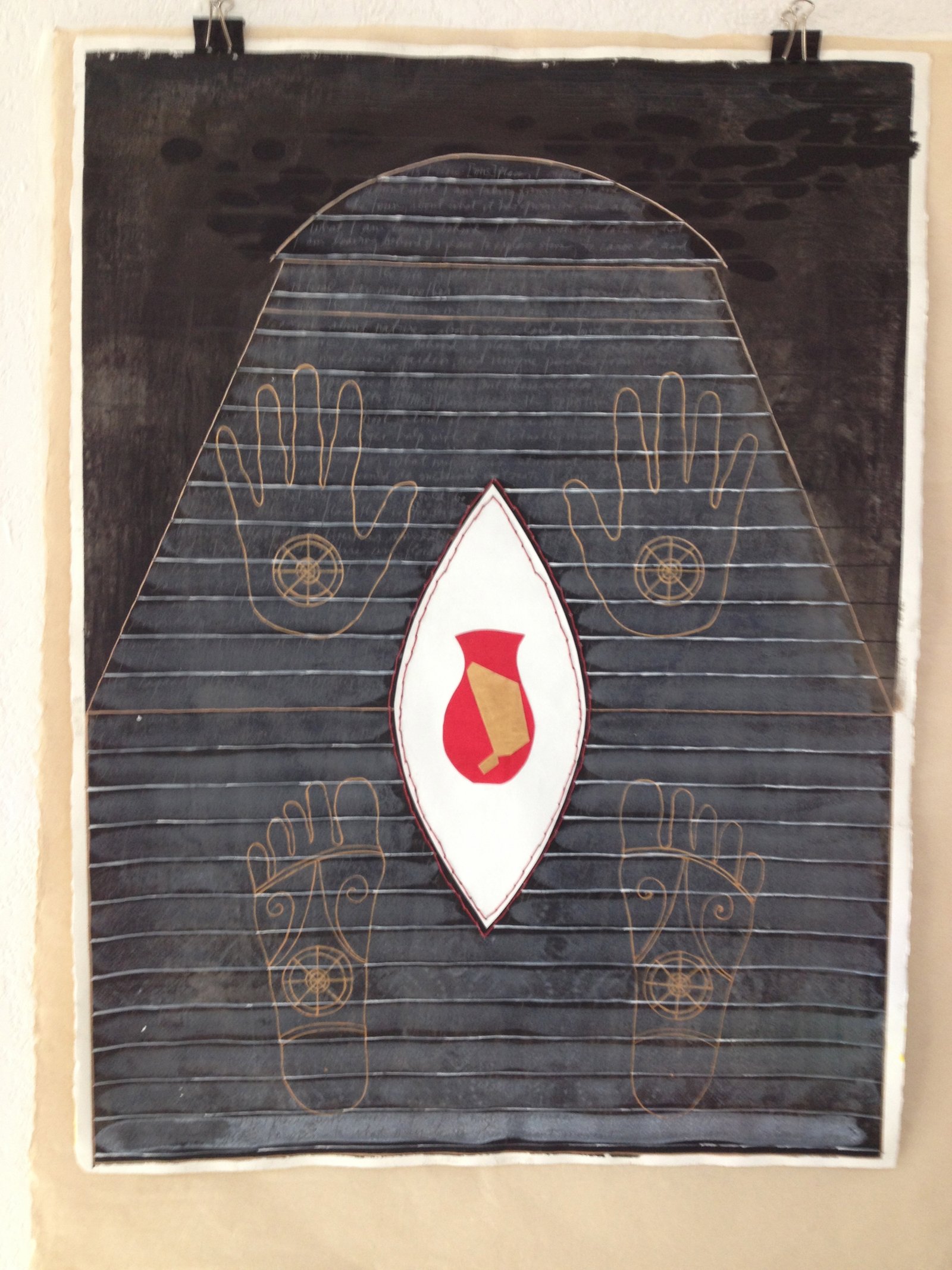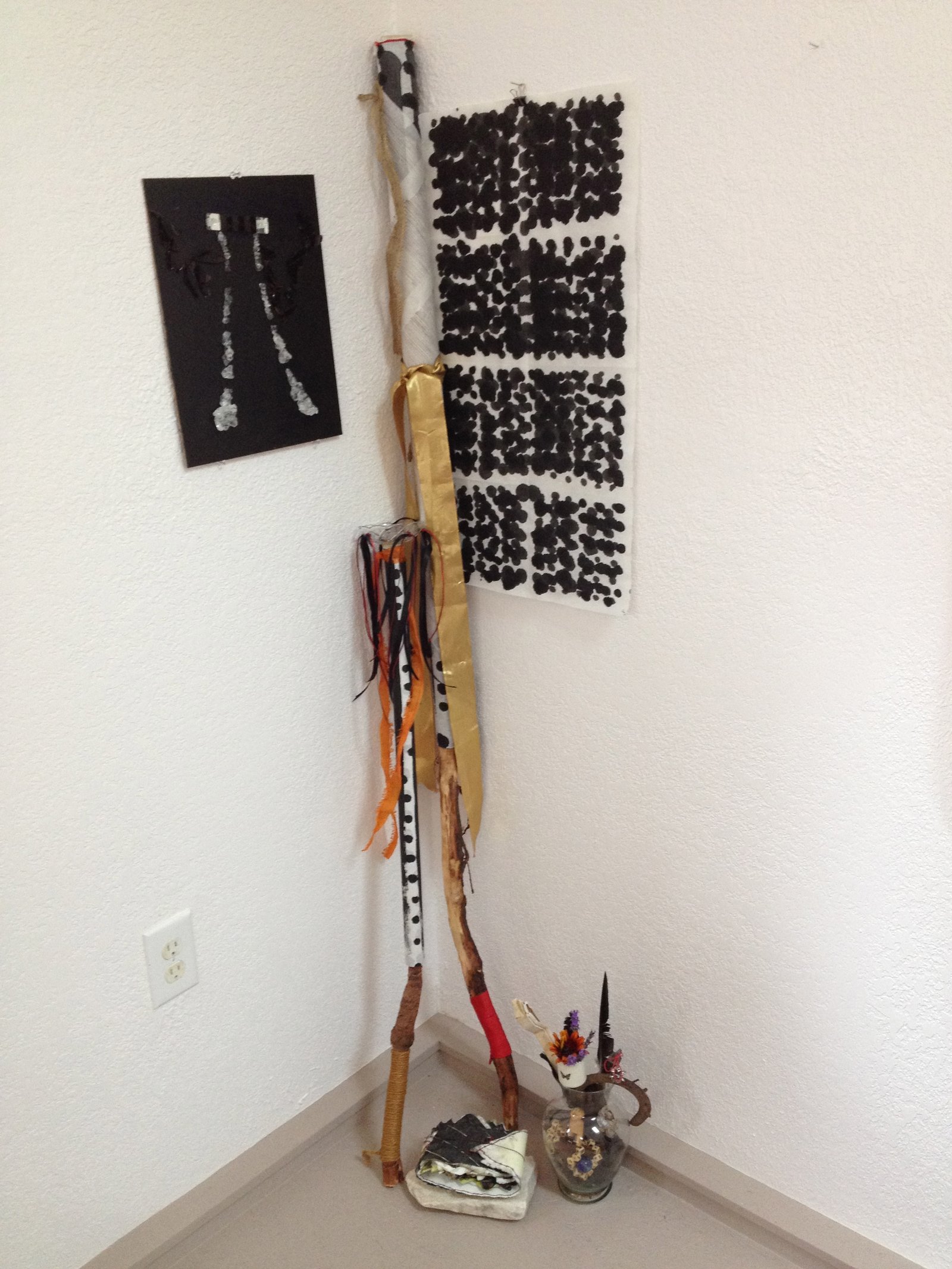 What follows is a series of snapshots about the progressive evolution of a drawing I made about my grief at the multiple losses, and one final photograph of all of the artifacts from this performance, set up in my Longmont studio. The drawing rests on a marble stone carved with the text amor fati, love of fate.
